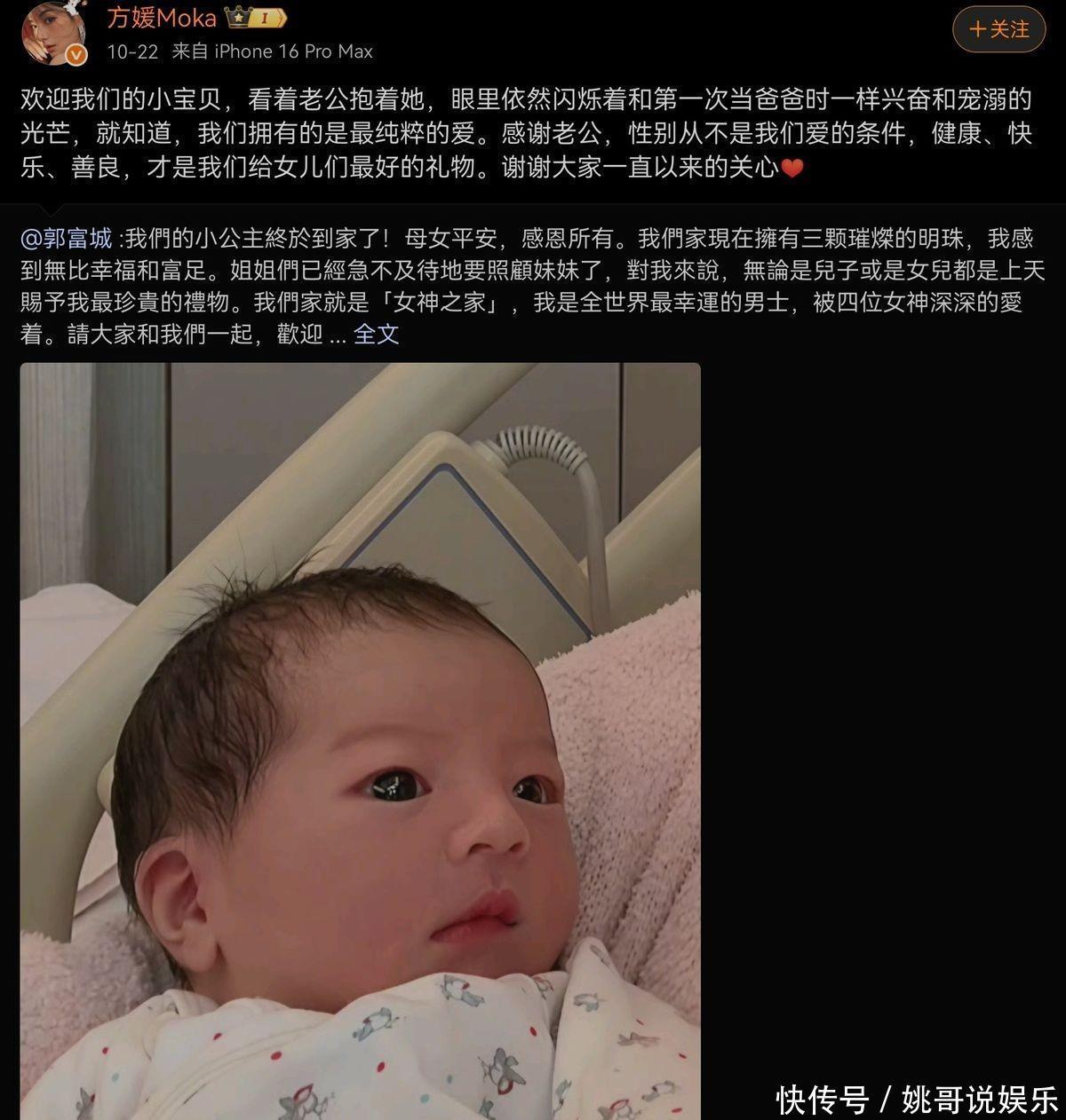 媒体曝光后,网友好奇,两人的三胎宝宝到底是男是女。还没等来狗仔和媒体的爆料,郭富城却先在社交媒体平台上官宣母女平安。